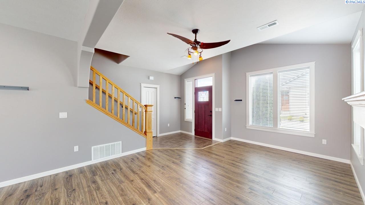MLS# 275468 This open concept floor plan has a great feel of light and space. The main level features luxury plank vinyl floors, large picture window in the living room, stone gas log fireplace with built-in media niche, architectural archways that blends into the dining room with a glass slider to the back deck. The kitchen has plenty of cabinets, quartz counters with subway tile back splash and stainless steel appliances. There is also a powder room and mechanical room with space to accommodate a pantry. The upper level features a spacious primary bedroom, well appointed bathroom with custom tile walk in shower and a large walk-in closet. There are two additional bedrooms, a full bathroom and laundry room on this level. Private fenced back yard and across the street from Sunnyside park and pathways.
